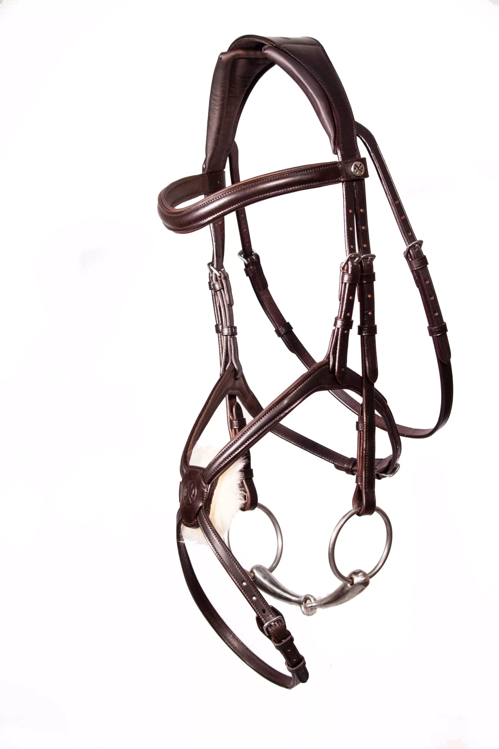 The throat lash strap has been strategically integrated into the headpiece to reduce the bulk in the sensitive TMJ area and allowing for the noseband and cheek piece buckles to lie flat against the horses skin.