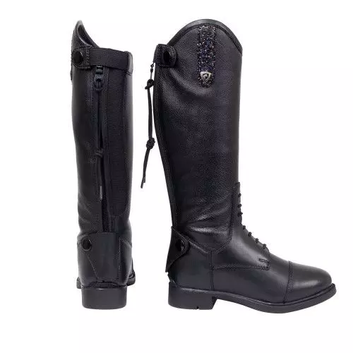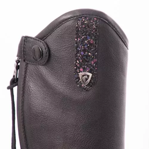 Ride in style! A traditional field boot look with an eye catching rainbow glitter strip to the top of the boot that will sparkle in the light. Made from a combination of real and synthetic leather with sturdy zip for ease of fastening and close contact feel, with secure top press stud closure. Including spur guard at the bottom of the boot and durable anti-skid sole for stability. The perfect addition to your boot collection, whether to wear every day or save for best. Black with Multicoloured Glitter