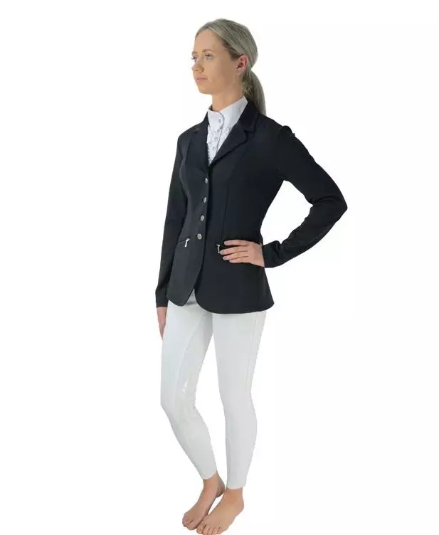 Designed for an active performance, this elegant fitted jacket is made from technical Flex-tech material to enable a full range of movement. The smart mesh overlay increases airflow to keep you cool and the technical stretch fabric is also quick drying. Four stunning diamante silver and black buttons fasten the jacket and the twin slits at the back ensure it sits correctly when you are in the saddle. The collar features subtle black diamantes on the trim which finish the look beautifully. Additional features include two front zipped pockets with silver YKK zips and contrasting mesh detail on the collar.