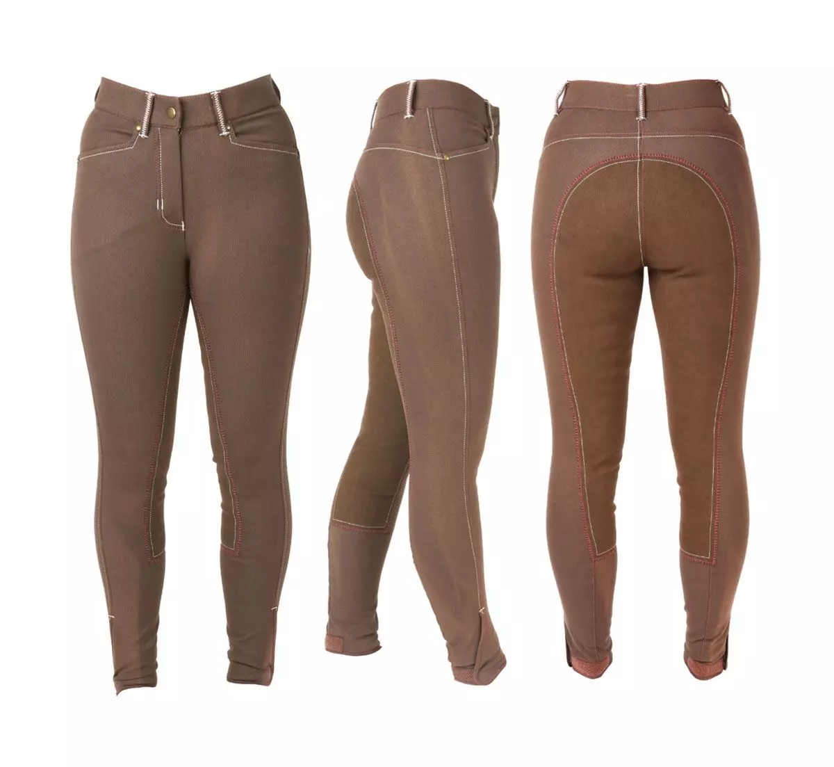 These flattering breeches give the denim look for style but are more stretchy, combined with a full leather seat, making the extremely comfortable to ride in, with added grip and support. Be fashionable and get the ‘jeggings’ look! They are perfect for the yard, shopping and riding. With Velcro closures at the ankles, jean like pockets, full zip fly, belt loops and contrast stitching. Machine washable at 40C. Leg length: Regular.
