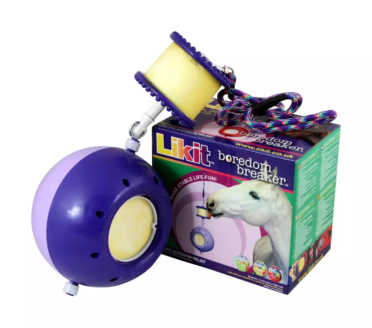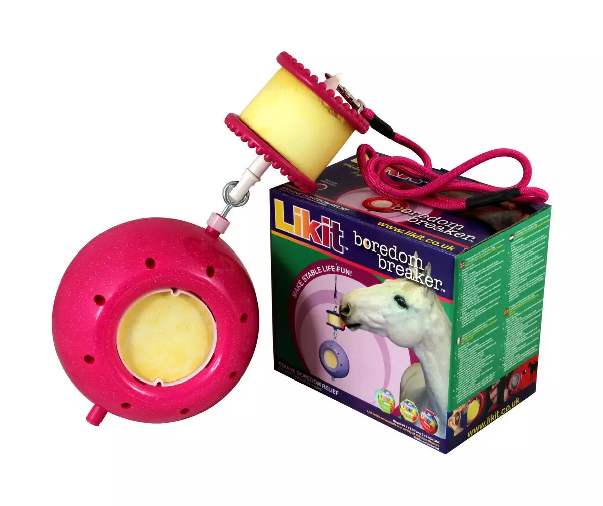 The is a combination toy that includes a Likit Holder and a robust ball with inserts for two Little Likits. As with the Likit Holder, the Boredom Breaker is designed to be hung in the stable wall and will swing and spin making them work hard for their reward.