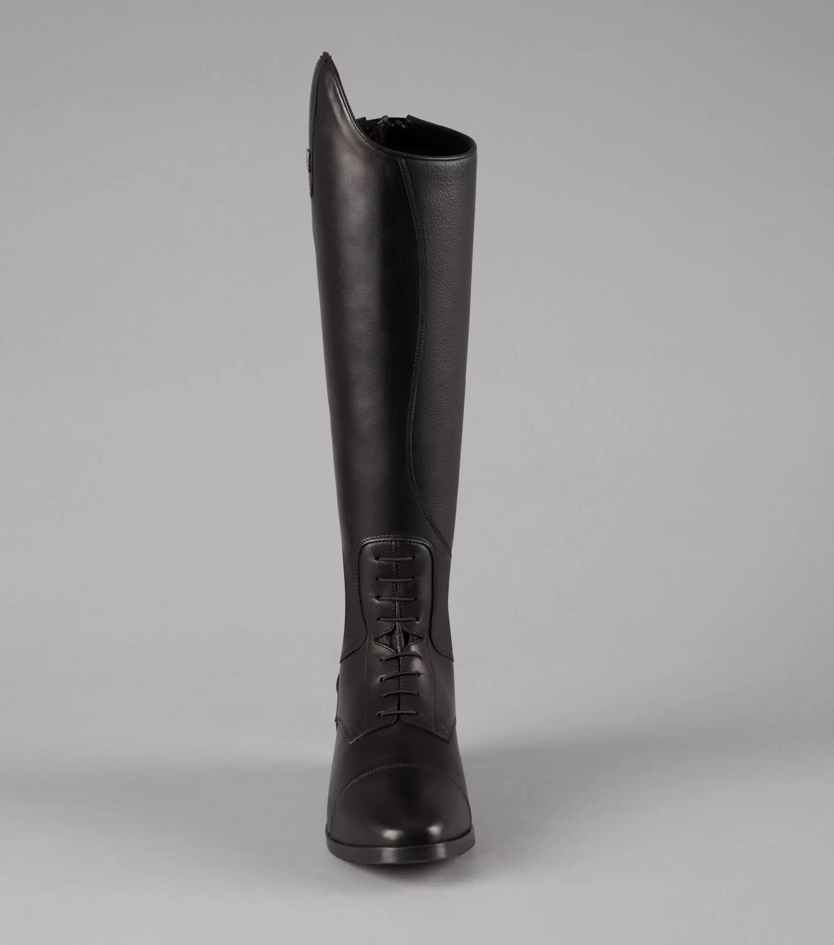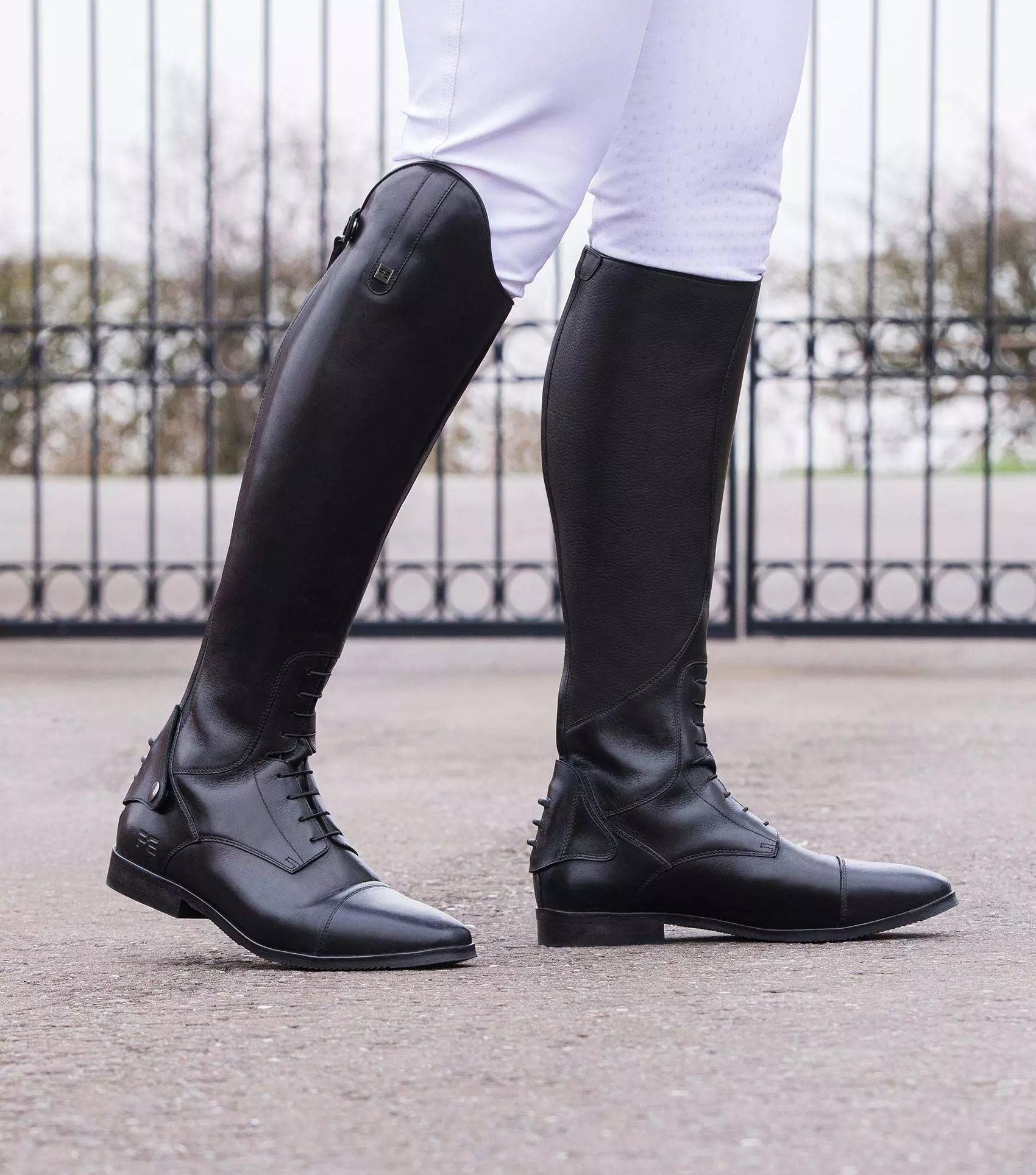 The freedom of movement that these leather riding boots provide is enhanced by the elastic lace panel, which increases flexibility and comfort around the ankle area. A full-length rear zip and snap button closure provide the means for easy and convenient removal. The Botero design provides a close contact, sculpted fit that contours the calf comfortably due to the discreet elastic panel which is strategically placed along the length of the zip.