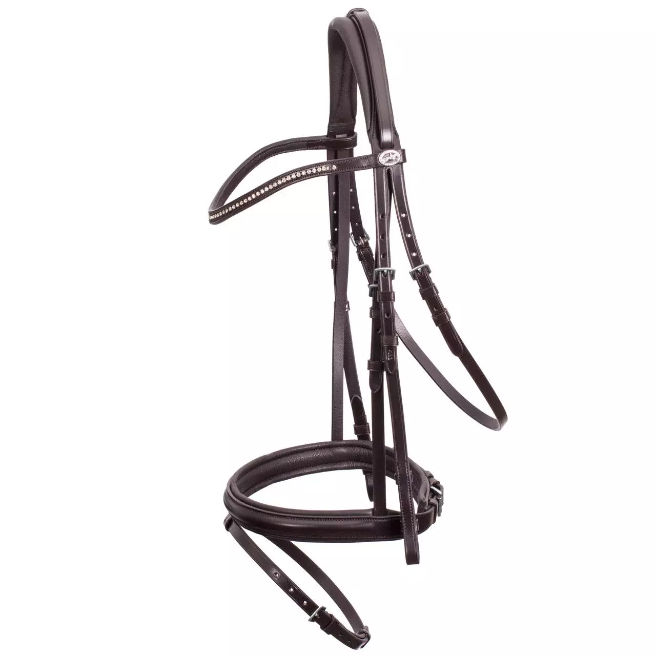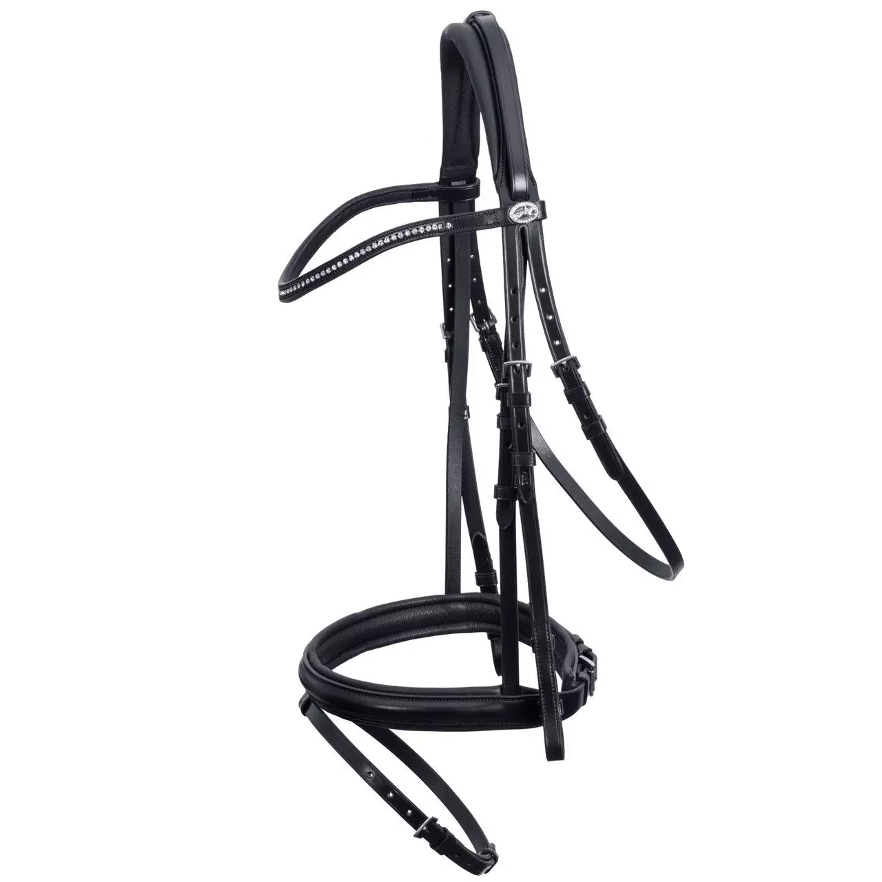 The Schockemohle Oslo Flash bridle from the classic line features an English combined noseband with roller buckle, approx. 30 mm wide | slightly shaped and softly padded head piece with noseband strap resting on top | curved browband with elegant crystal stones | cheek pieces with hook & stud | throat lash adjustable on both sides | new logo button.