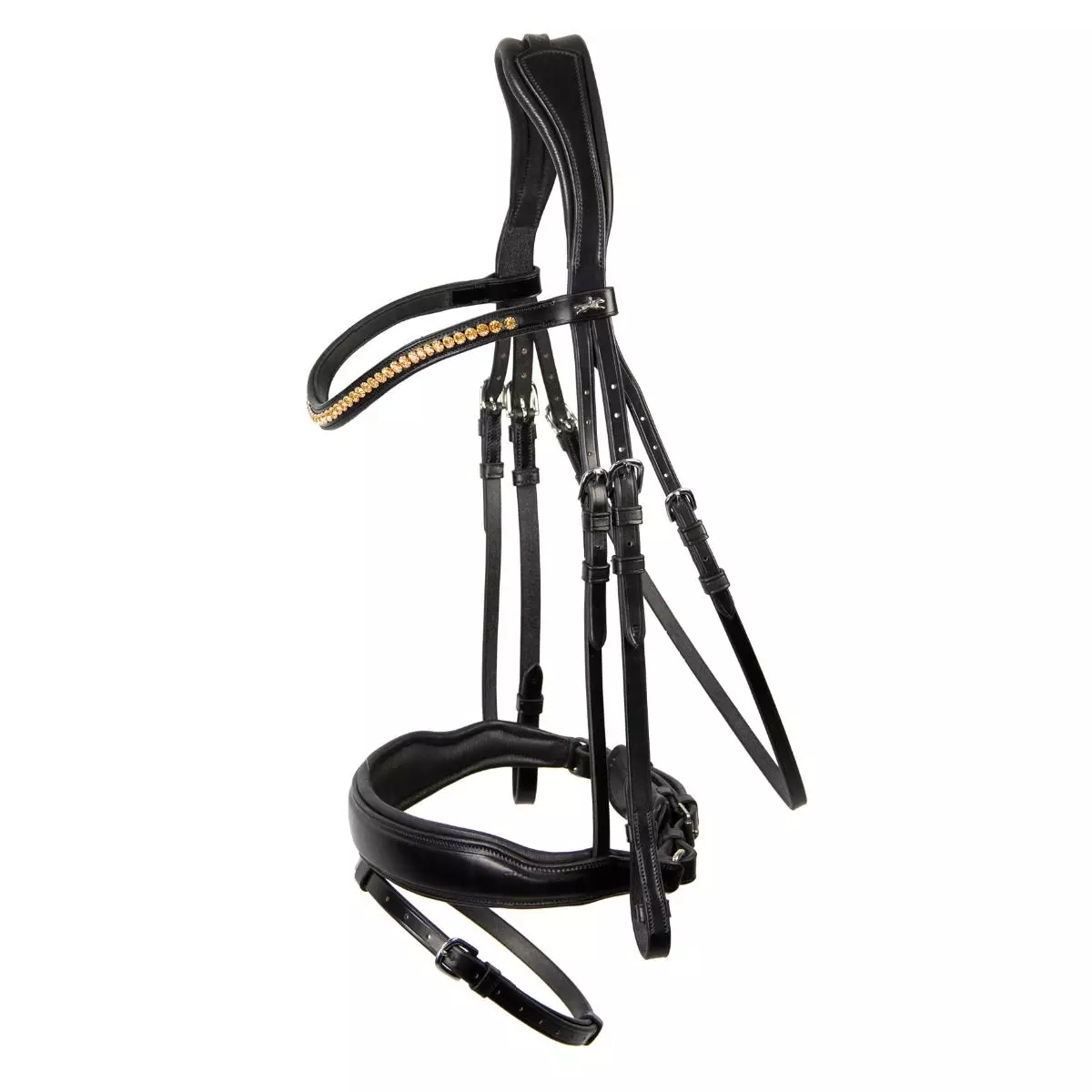 As individual as your horse: The Stanton Select bridle is part of the popular Select & Mix collection from Schockemöhle Sports and can be combined as you wish. This model is also completely tailored to the needs of horses. The anatomically shaped, narrow headpiece with flat sides and a wide noseband with a cheekbone cutout give this bridle its elegant appearance and at the same time offer the horse the maximum comfort factor. The headband with large orange crystals is a special eye-catcher.