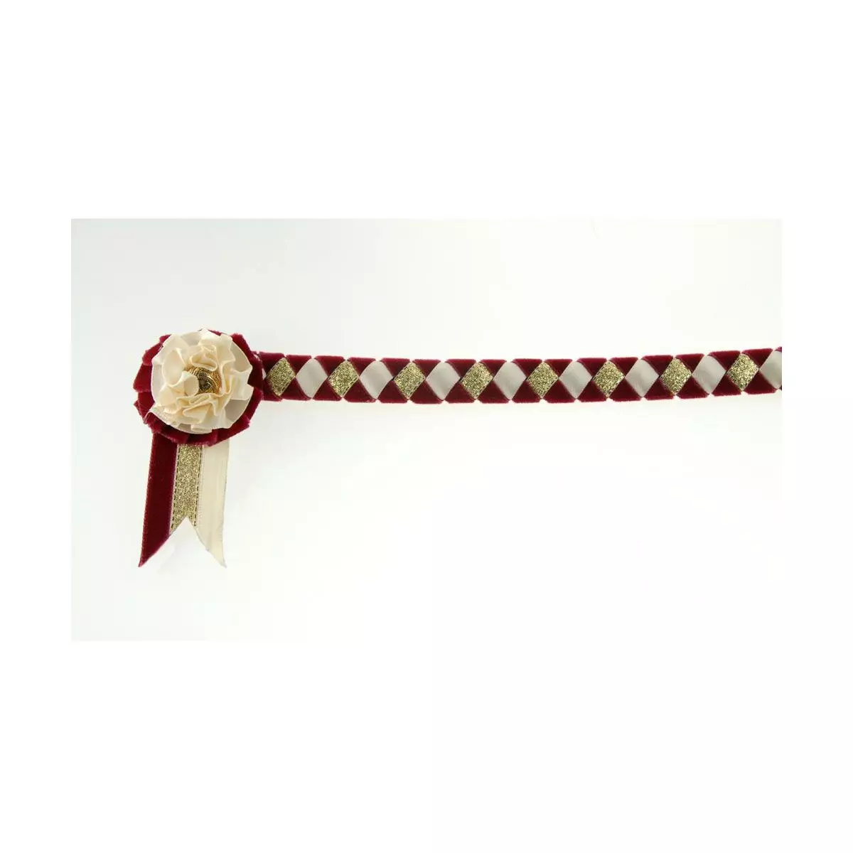 Each Newport Browband is individually hand-plaited on 1/2″ (12.7mm) leather using a diamond design. Created with satin and lurex ribbons running through velvet ribbon, the Newport Browband is beautifully finished with small, two-layered rosettes and narow W-shaped tabs.